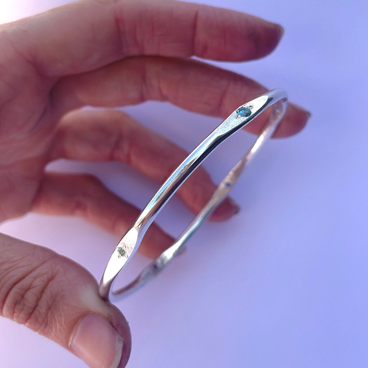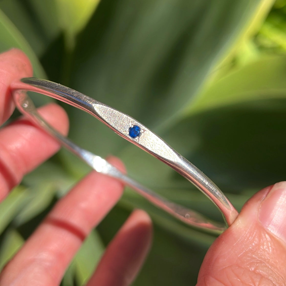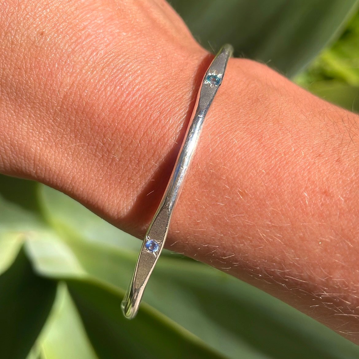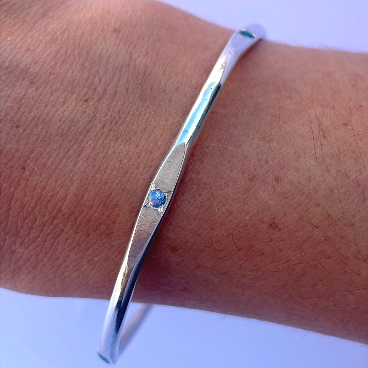 Featuring a 2.5mm Australian sapphire, 3mm tourmaline, 2.5mm madagascan sapphire, 2mm peridot and 3mm London blue topaz