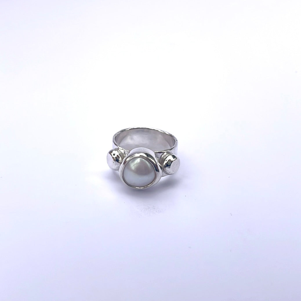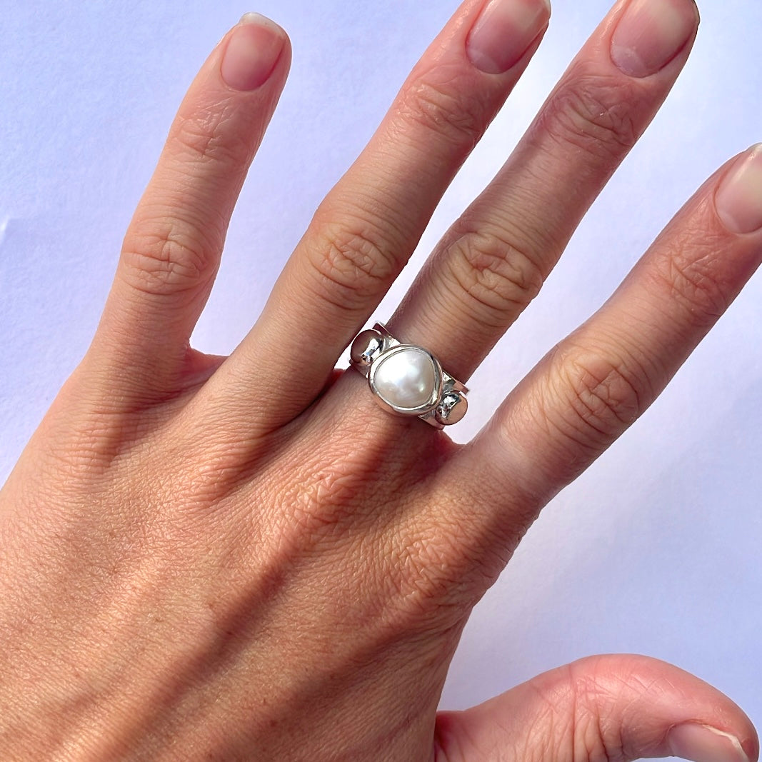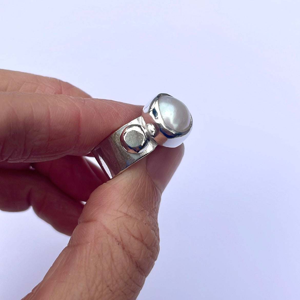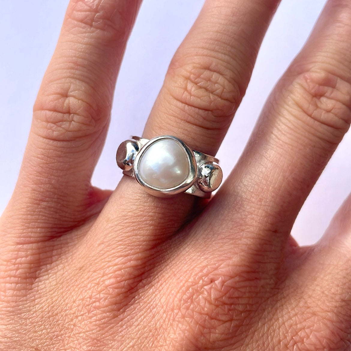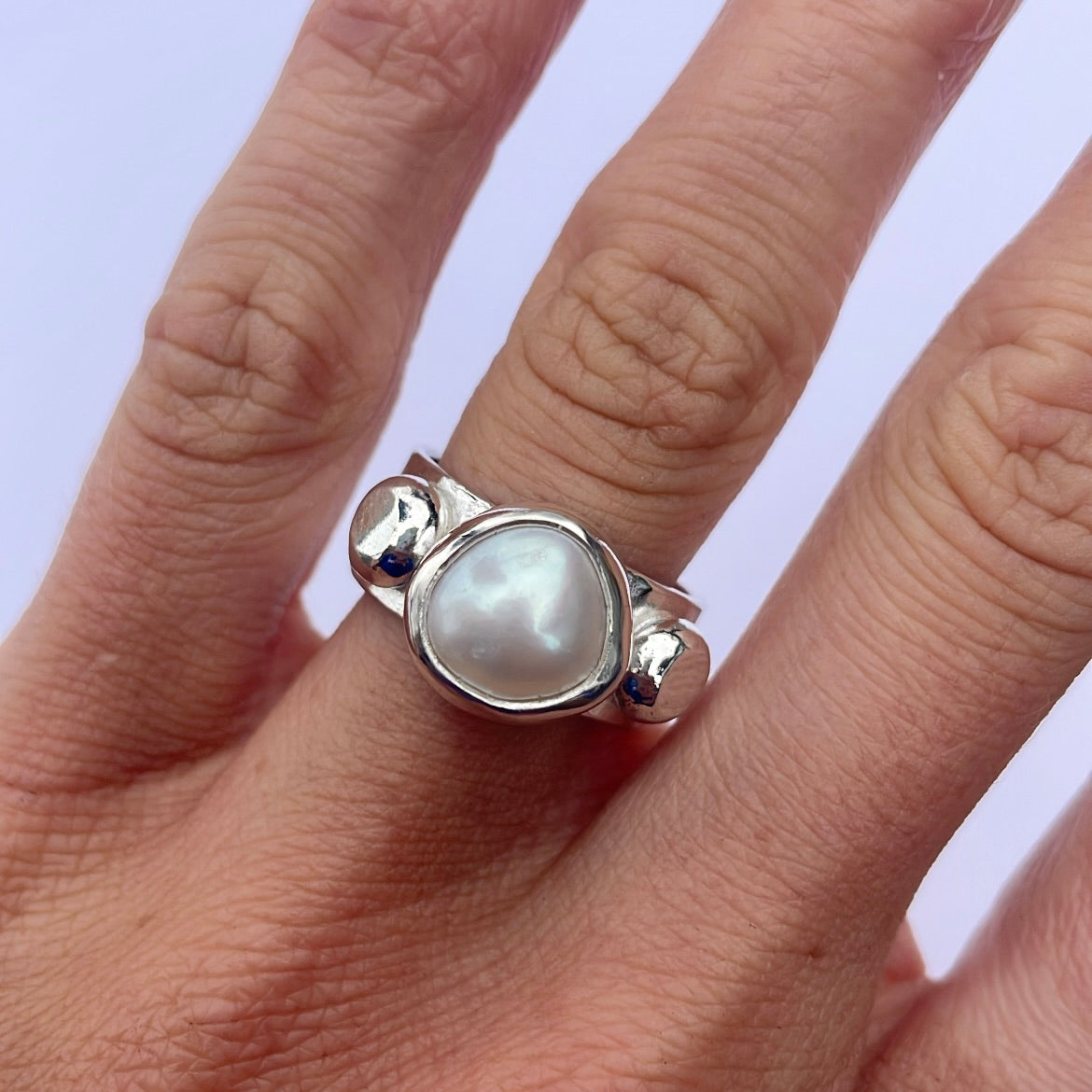 A natural keshi pearl bezel set in a chunky 925 sterling silver band