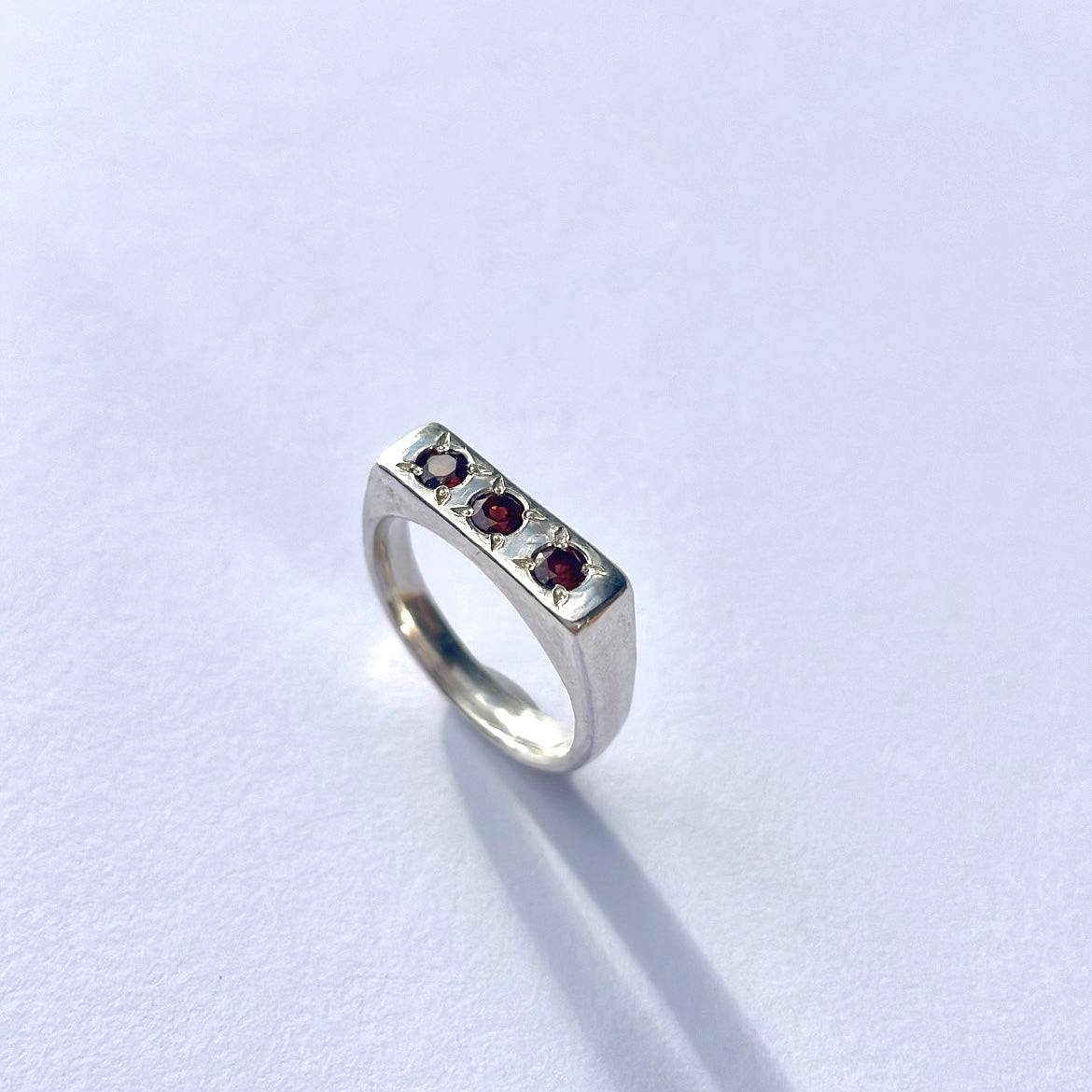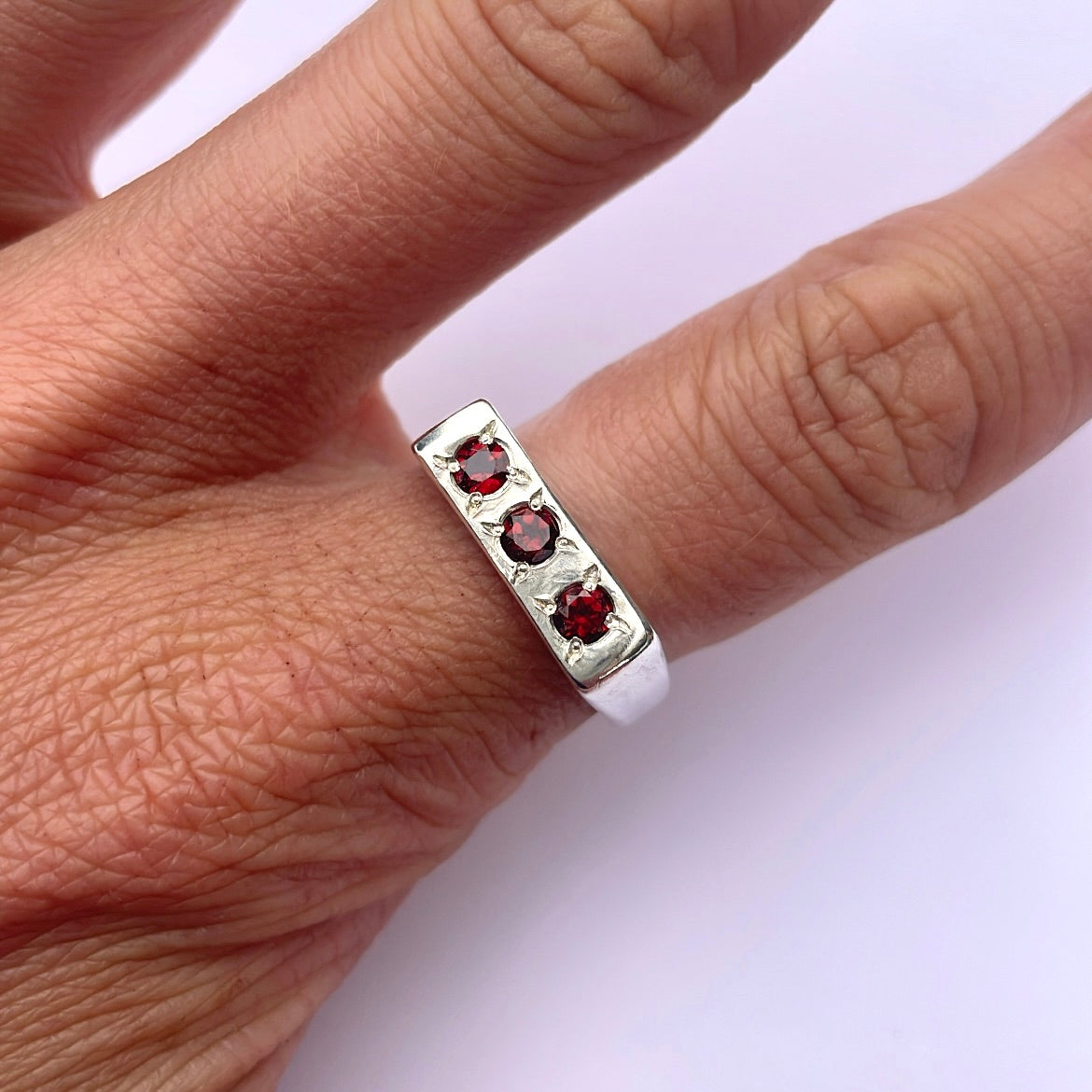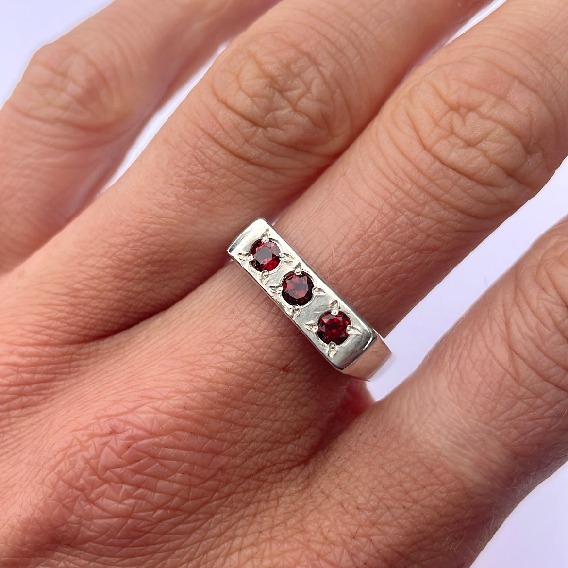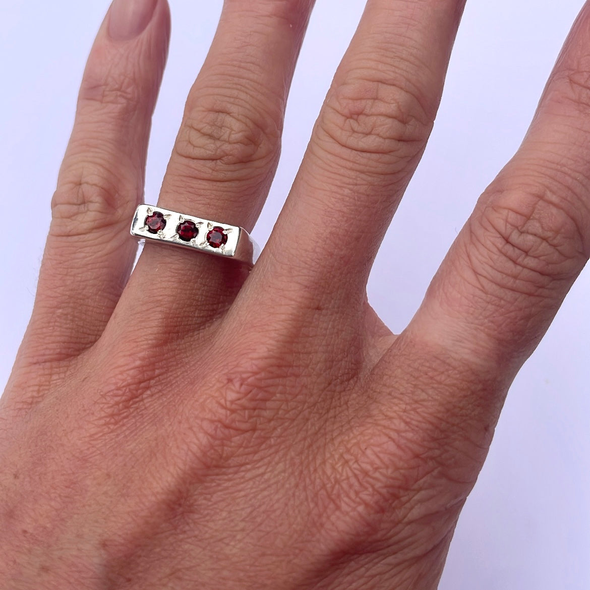 a 925 sterling silver bar signet set with three 3.25mm almandine garnets
