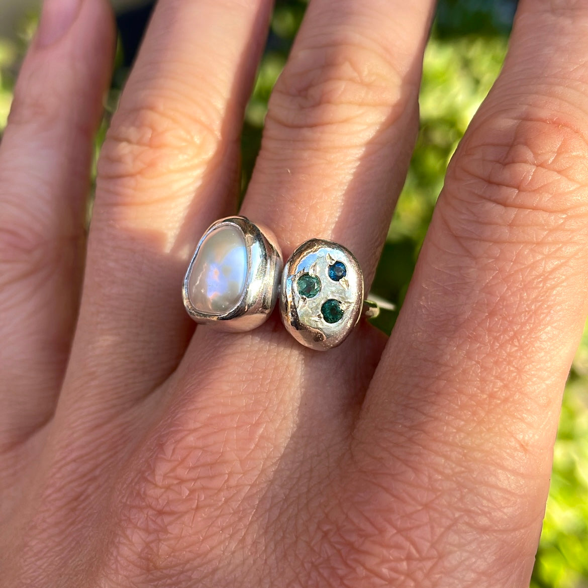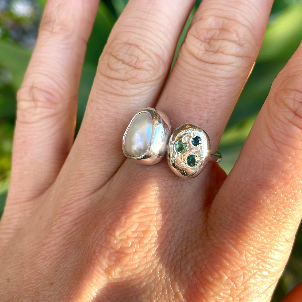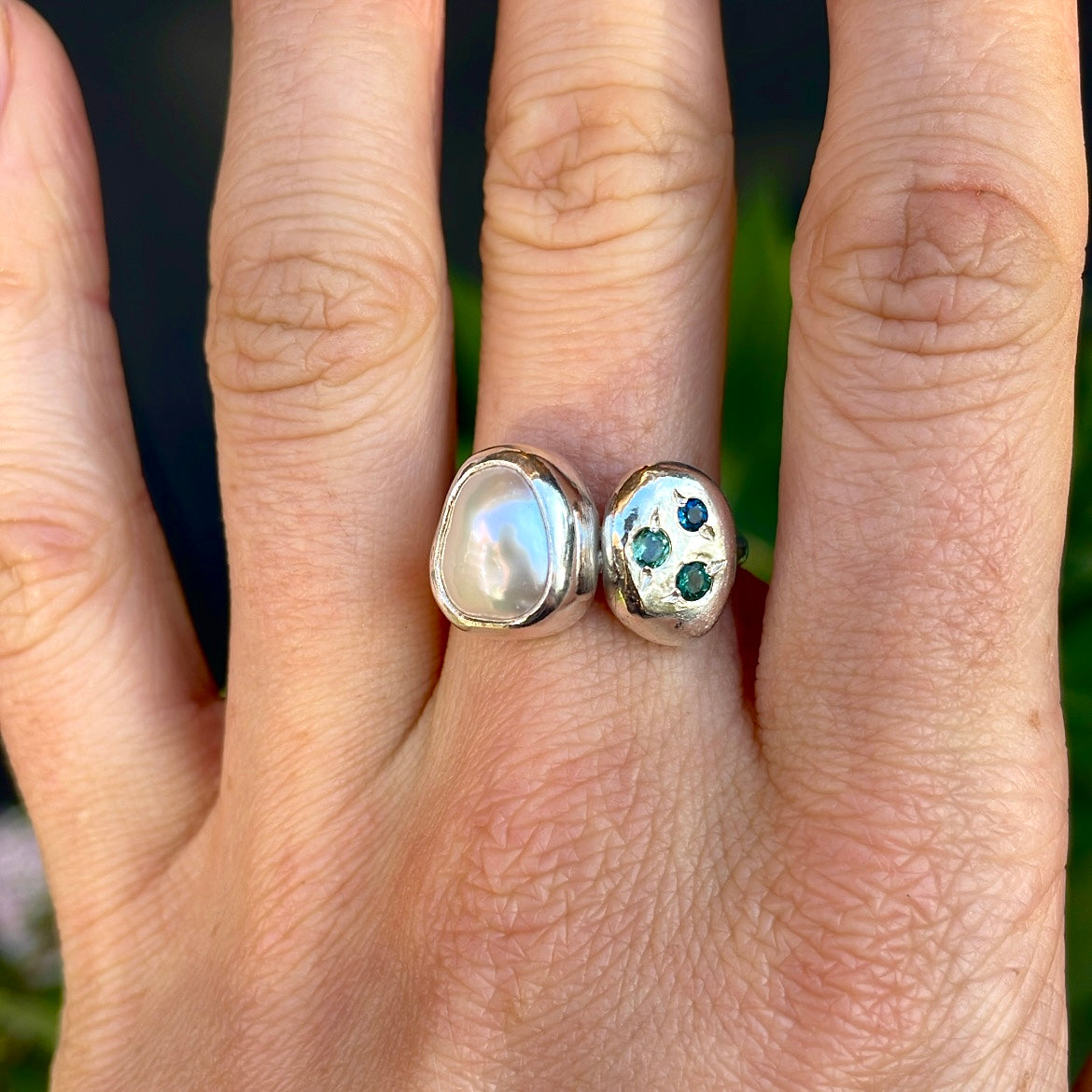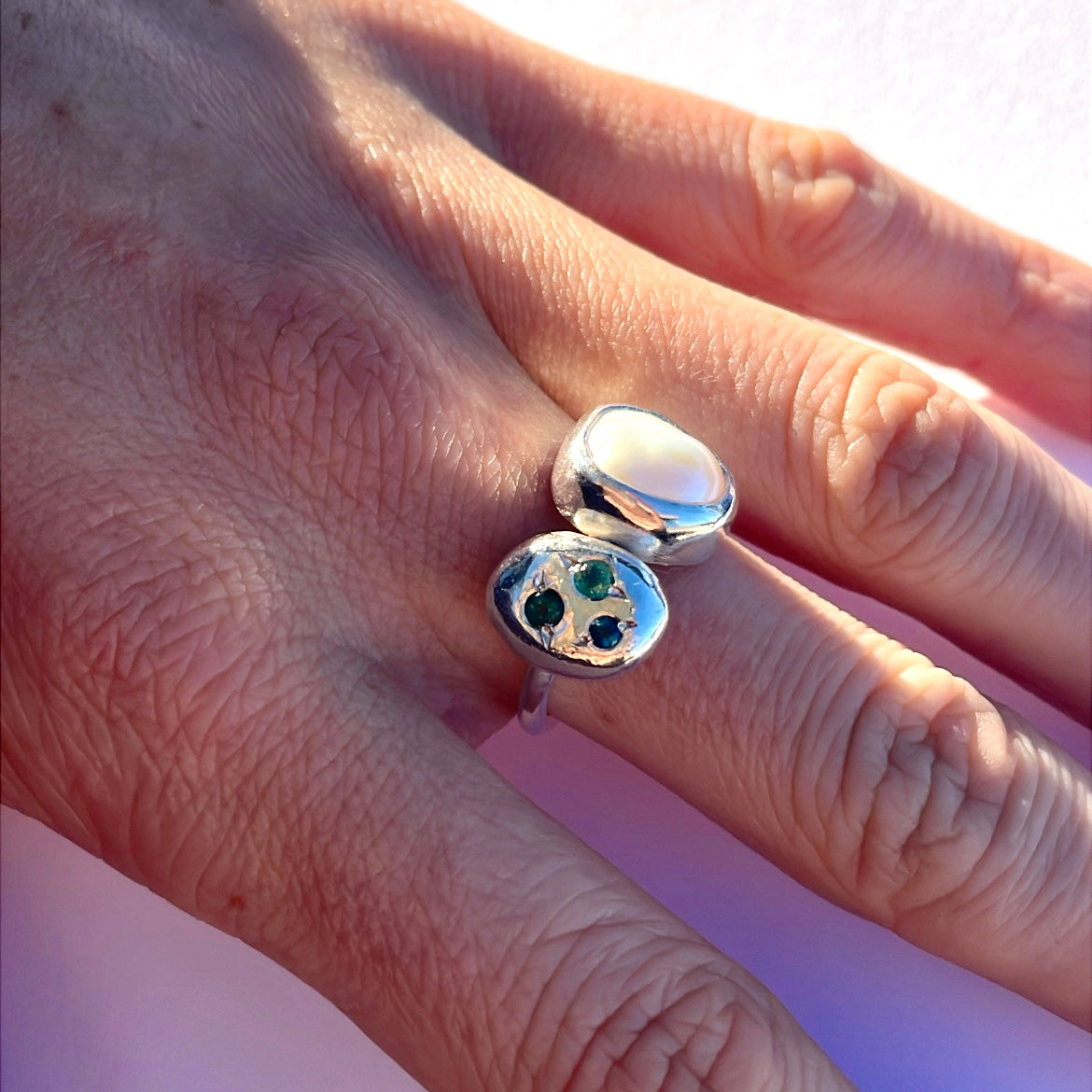 A beautiful freshwater keshi pearl and three 2.5mm natural tourmalines set in 925 sterling silver.